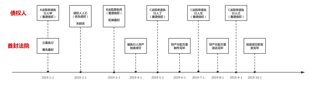 【基本案情】为了更方便论述,本文虚构了一个参与分配的典型案例:债权人甲对债务人起诉并申请执行,负责执行的A法院已对被执行人财产实施首封,后债权人乙、丙、丁、戊、己分别依据不同的理由,在不同的时间点向执行法院申请参与分配,详见下图。