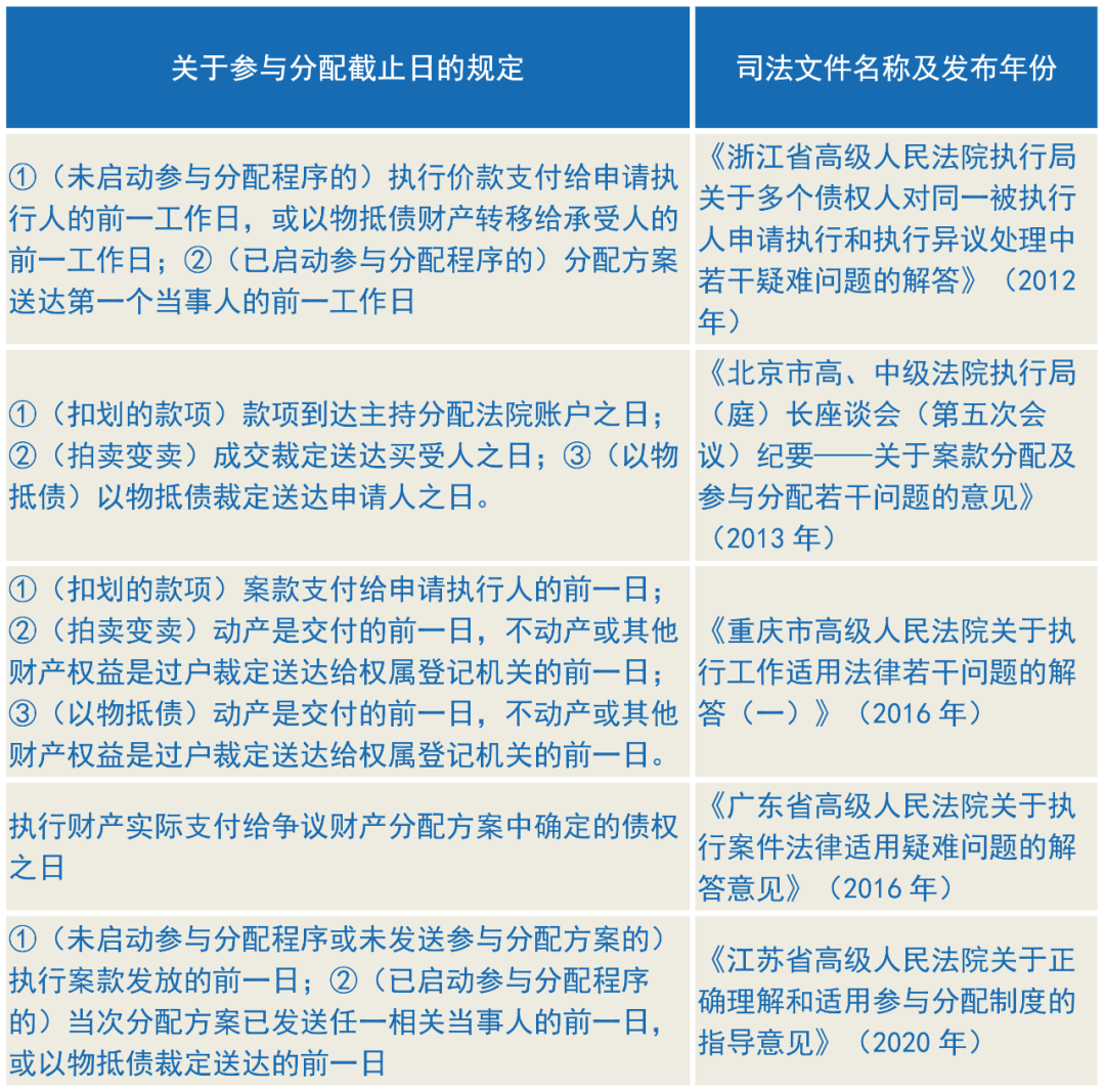 (3)待分配财产为非货币类财产,流拍或者变卖不成后以物抵债的,申请参与分配的截止时间为抵债裁定送达之日的前一日。